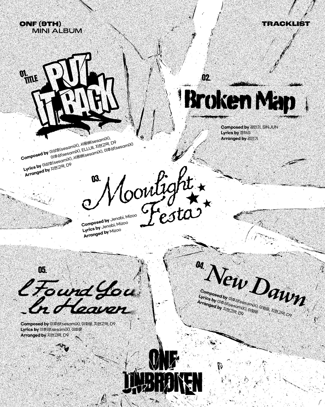트랙리스트에 따르면, 이번 미니 9집 앨범에는 타이틀 곡 'Put It Back'(풋 잇 백)을 포함 'Broken Map'(브로큰 맵), 'Moonlight Festa'(문라이트 페스타), 'New Dawn'(뉴 던), 'I Found You In Heaven'(아이 파운드 유 인 헤븐)까지 총 5곡이 수록되어 있다.
