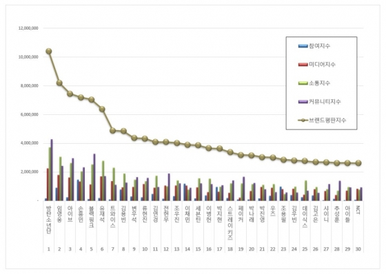 2025년 10월 스타 브랜드평판 30위 순위는 방탄소년단, 임영웅, 아이브, 손흥민, 블랙핑크, 유재석, 트와이스, 김용빈, 변우석, 류현진, 김연경, 전현무, 조우진, 이채민, 세븐틴, 이병헌, 박지현, 스트레이 키즈, 페이커, 박나래, 박진영, 우즈, 조용필, 김우빈, 데이식스, 김고은, 샤이니, 추성훈, 아이들, NCT 순으로 분석됐다.