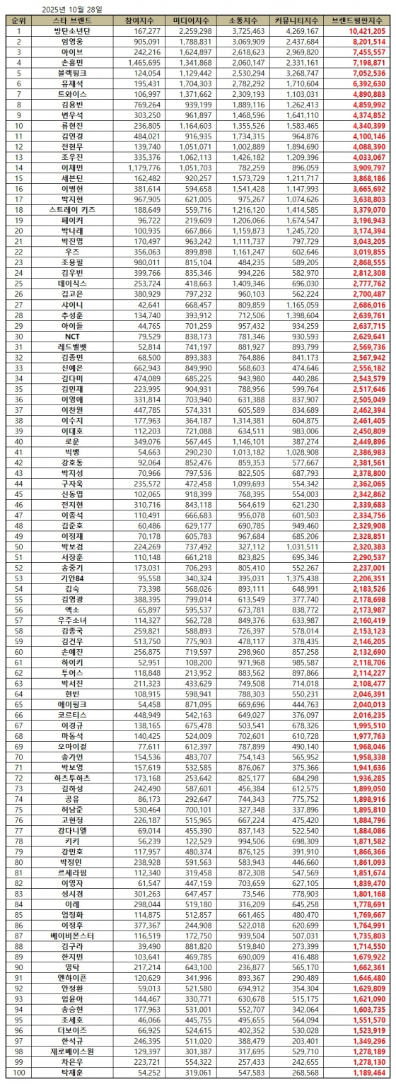 스타 브랜드평판 2025년 10월 빅데이터 분석 100위는 방탄소년단, 임영웅, 아이브, 손흥민, 블랙핑크, 유재석, 트와이스, 김용빈, 변우석, 류현진, 김연경, 전현무, 조우진, 이채민, 세븐틴, 이병헌, 박지현, 스트레이 키즈, 페이커, 박나래, 박진영, 우즈, 조용필, 김우빈, 데이식스, 김고은, 샤이니, 추성훈, 아이들, NCT, 레드벨벳, 김종민, 신예은, 김다미, 김민재, 이영애, 이찬원, 이수지, 이대호, 로운, 빅뱅, 강호동, 박지성, 구자욱, 신동엽, 전지현, 이종석, 김준호, 이정재, 박보검, 서장훈, 송중기, 기안84, 김숙, 김영광, 엑소, 우주소녀, 김종국, 김건우, 손예진, 하이키, 투어스, 박서진, 현빈, 에이핑크, 코르티스, 이경규, 마동석, 오마이걸, 송가인, 박보영, 하츠투하츠, 김하성, 공유, 허남준, 고현정, 강다니엘, 키키, 강민호, 박정민 , 르세라핌, 이영자, 성시경, 이레, 엄정화, 이정후, 베이비몬스터, 김구라, 한지민, 영탁, 엔하이픈, 안정환, 임윤아, 송승헌, 조세호, 더보이즈, 한석규, 제로베이스원, 차은우, 탁재훈 순으로 분석됐다.