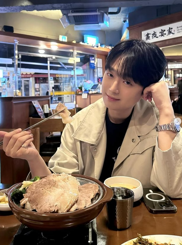 이찬원은 식당에서 보쌈을 들고 카메라를 그윽하게 바라보는 사진을 남겼다. 그는 소위 '남친샷' 분위기를 자아내며 팬들에게 인사했다.