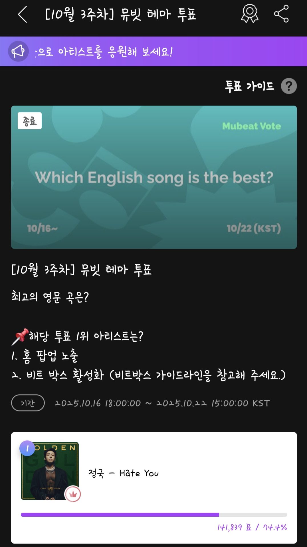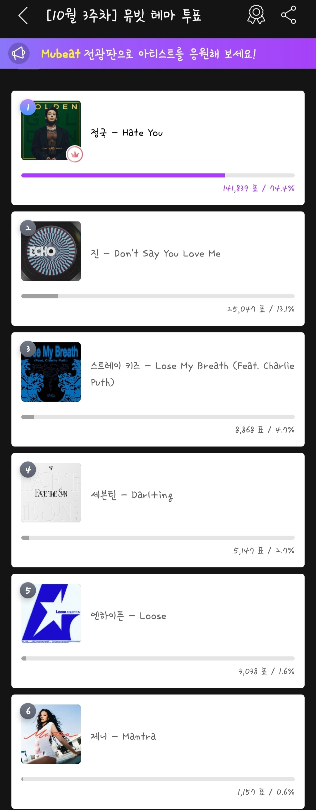 정국이 2023년 11월 발매한 첫 솔로 앨범 'GOLDEN'(골든) 수록곡 'Hate You'는 10월 16일~22일까지 글로벌 K-팝 플랫폼 뮤빗(Mubeat)에서 진행된 '최고의 영문 곡은?' 설문에서 1위를 차지했다. 'Hate You'는 14만 1839표를 얻어 전체 투표 수의 74.4%에 달하는 압도적인 득표율을 기록했다.