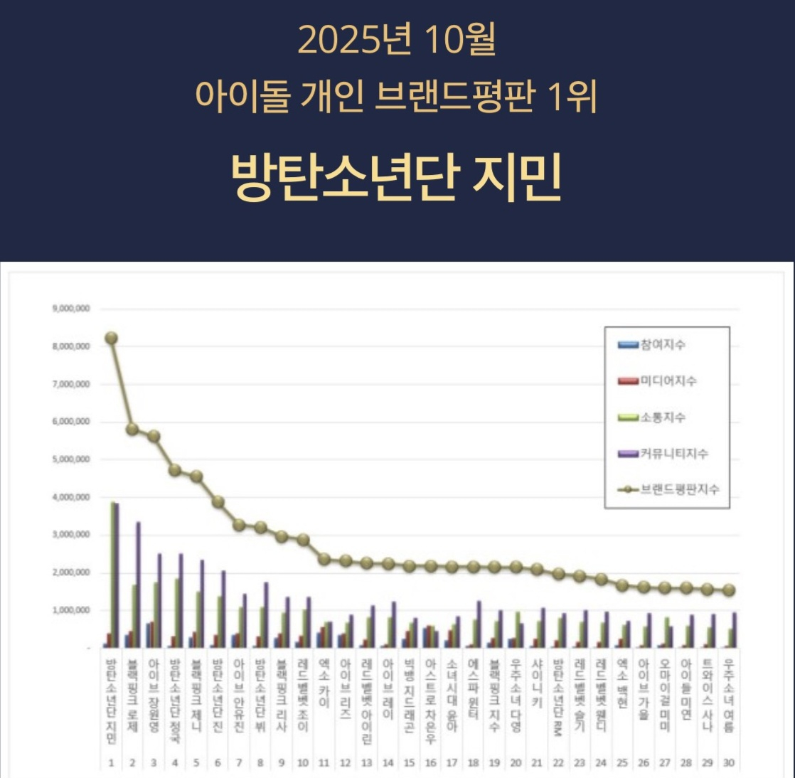방탄소년단(BTS) 지민이 자신의 생일달인 10월, 보이그룹 개인 브랜드평판과 아이돌 통합 개인 브랜드평판 모두에서 1위를 차지하며 압도적인 인기를 입증했다.