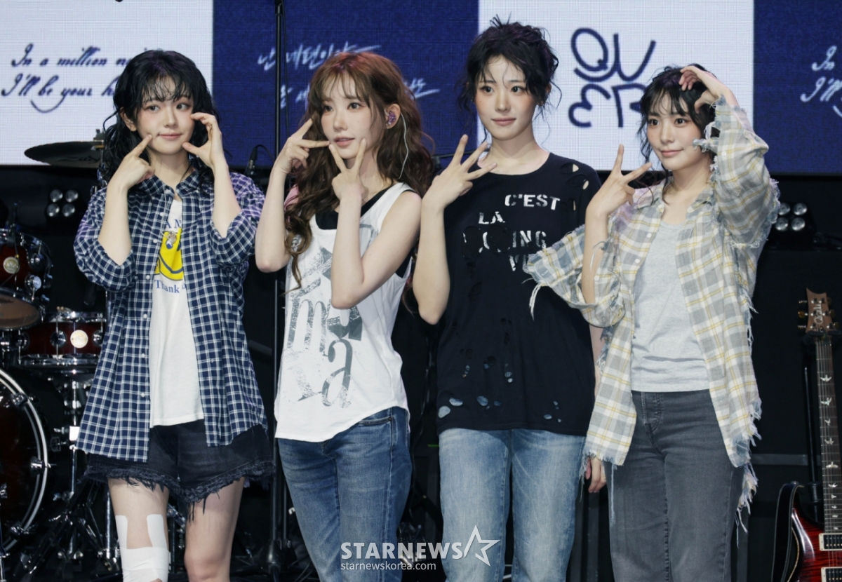 밴드 QWER이 9일 오후 서울 창천동 예스24 원더로크홀에서 진행된 미니 3집 '난 네 편이야, 온 세상이 불협일지라도' 쇼케이스에서 포즈를 취하고 있다. 이번 앨범의 타이틀곡 '눈물참기'는 눈물을 참을 수 없는 슬픔에도 희망찬 내일을 위해 다시 한 걸음 내딛는 곡으로 멤버 전원이 작사에 참여했다. /2025.06.09 /사진=이동훈 photoguy@