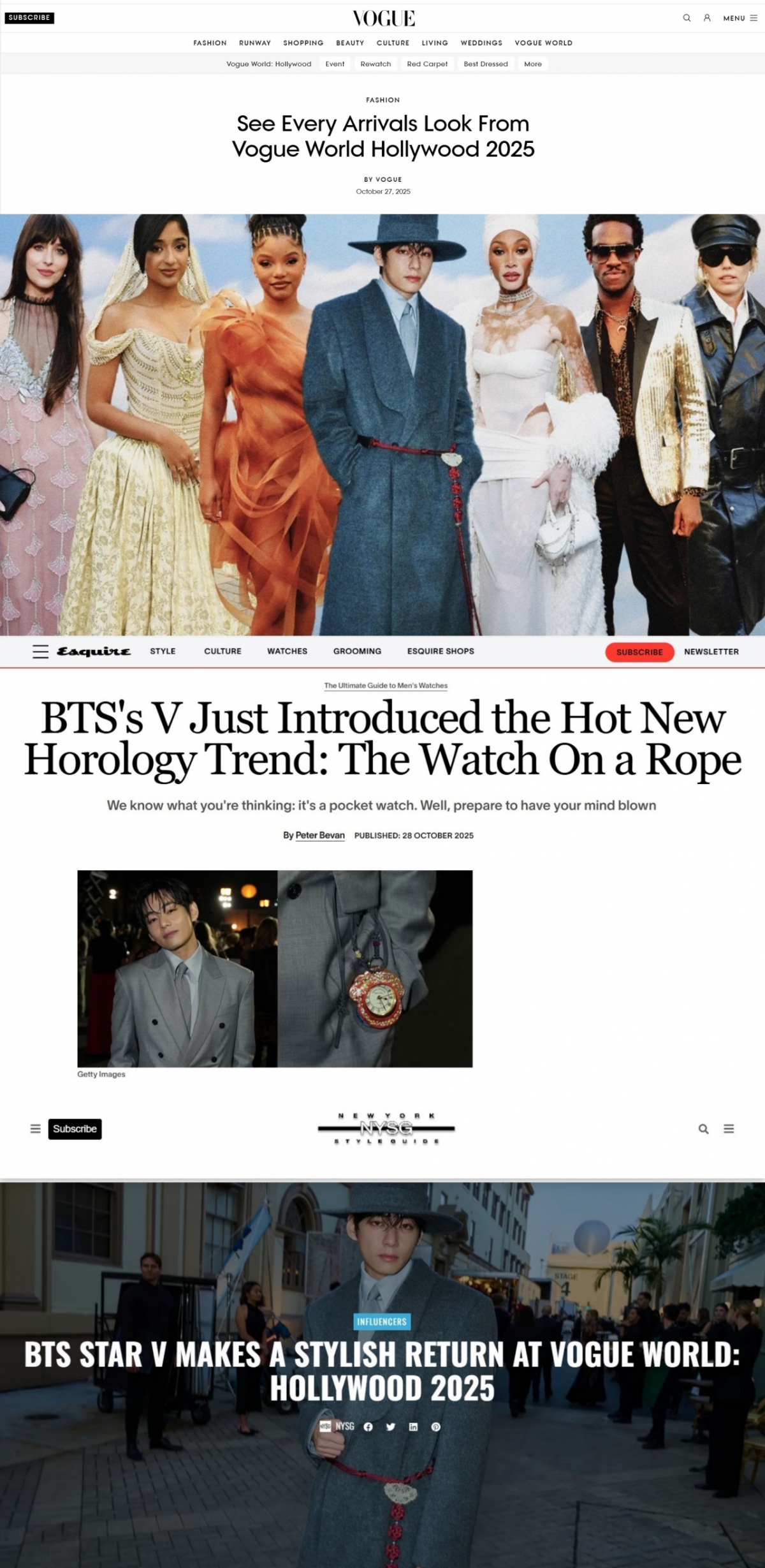 미국 패션, 엔터테인먼트, 라이프스타일 매거진 뉴욕 스타일 가이드(NYSG)는 "뷔, '2025 보그 월드: 할리우드'에서 스타일리시하게 컴백하다"라는 기사에서 "뷔가 전역 후 할리우드에 화려하게 등장, 마이크 대신 하이패션의 스포트라이트를 받으며, 모던한 테일러링과 문화적 감성이 어우러진 앙상블을 선보였다"고 집중 조명했다.
