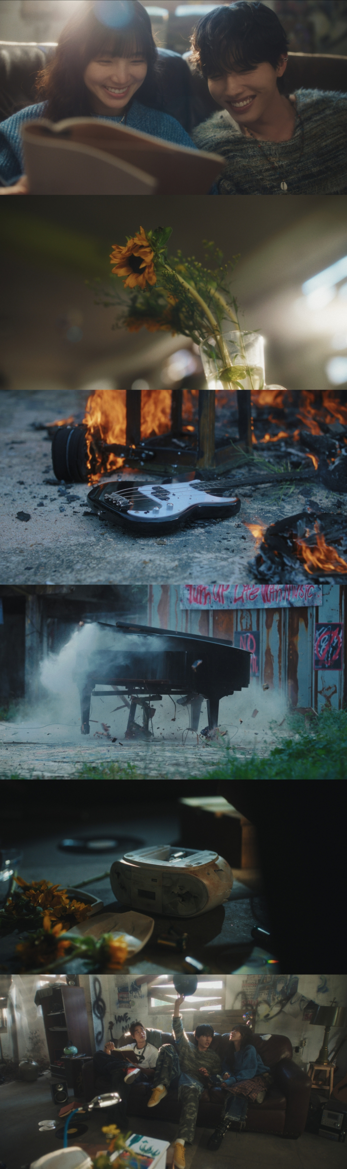 뮤직비디오는 블랙핑크, 트와이스, 아이유를 비롯해 세계적인 K팝 아티스트와 협업한 815 VIDEO가 연출을 맡아 섬세한 영상미와 감각적인 스토리텔링을 완성했다. 불타오르는 악기와 부서지는 그랜드 피아노가 교차하며 강렬한 긴장감을 자아내는가 하면, 아지트 속 세 사람이 함께 웃고 어울리는 평온한 순간들과 야구 배트를 든 인물로 인해 미묘한 균열을 맞는 과정을 통해 '사랑은 어쩌고'에 담긴 의미를 극대화했다.