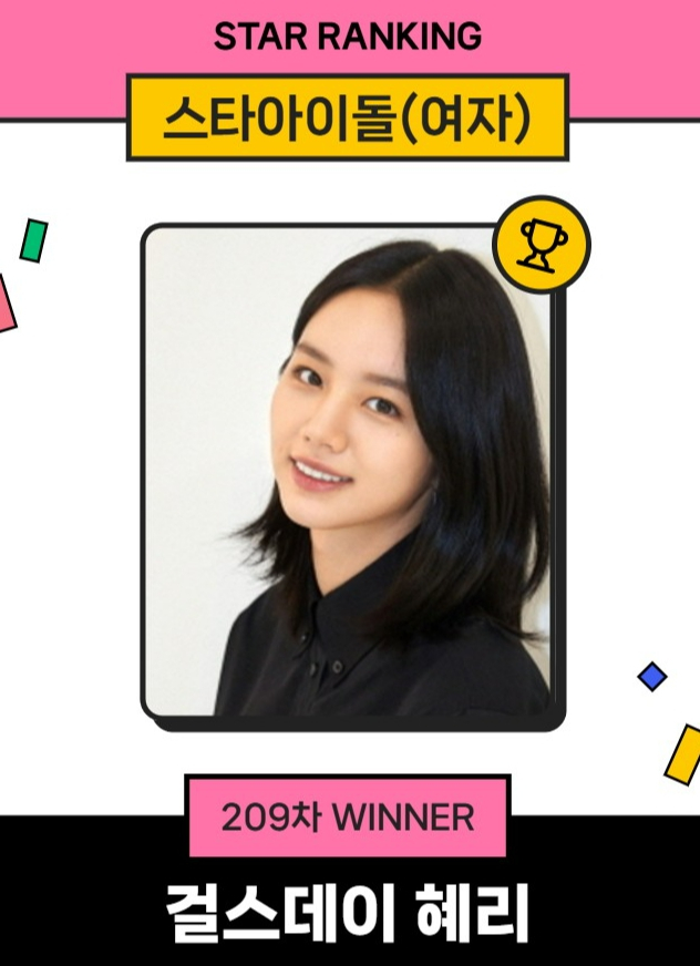 혜리는 지난 23일 오후 3시 1분부터 30일 오후 3시까지 진행된 209차 스타랭킹 스타아이돌 여자 랭킹 투표에서 레드벨벳 아이린, 소녀시대 윤아를 꺾고 1위를 차지했다.