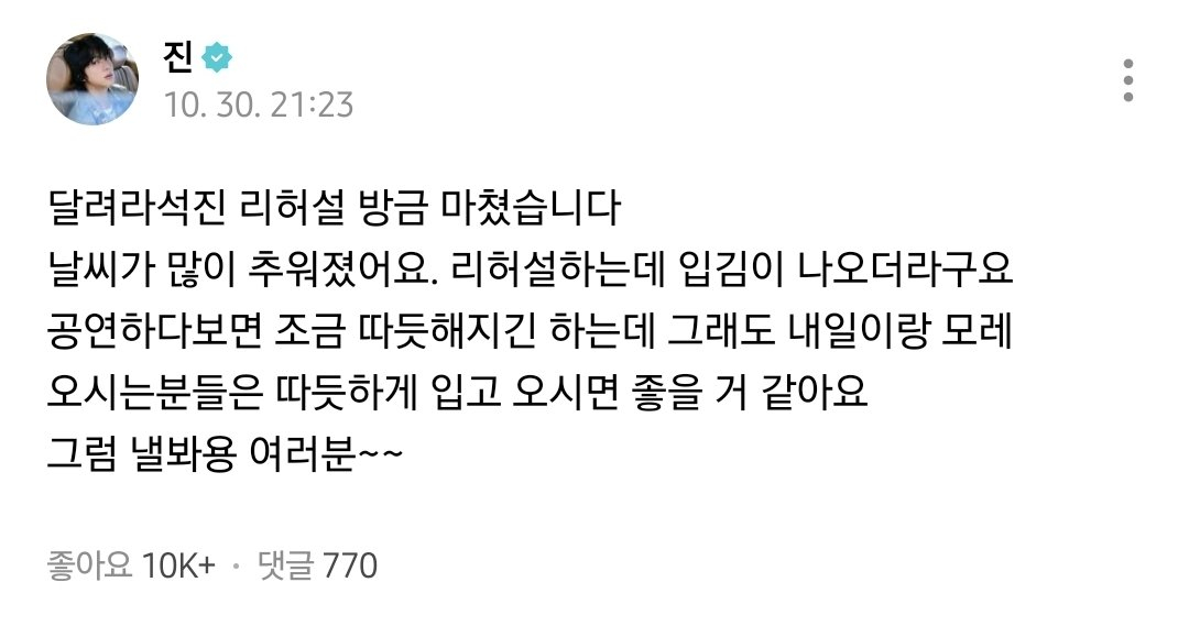 지난 30일 밤, 진은 글로벌 팬 커뮤니티 위버스를 통해 "달려라석진 리허설 방금 마쳤습니다. 날씨가 많이 추워졌어요. 리허설하는데 입김이 나오더라구요. 공연하다보면 조금 따뜻해지긴 하는데 그래도 내일이랑 모레 오시는분들은 따뜻하게 입고 오시면 좋을 거 같아요. 그럼 낼봐용 여러분~~"이라는 글을 남겨 공연에 오는 팬들을 걱정하며 뜨거운 팬사랑을 보였다.