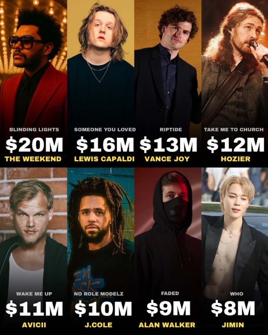 이 보고서는 전 세계 각국의 대표 아티스트를 기준으로 스포티파이 스트리밍 수익을 추정한 자료이다. 지민은 한국 아티스트 중 유일하게 글로벌 수익 Top10에 랭크됐다.