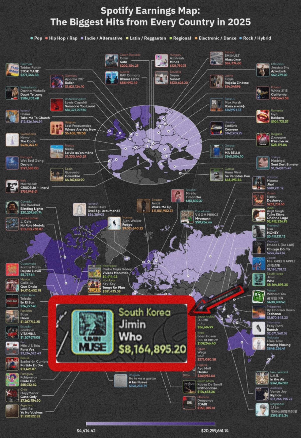 영국의 글로벌 금융 데이터 플랫폼 '트레이딩플랫폼스'(TradingPlatforms)의 최신 보고서 'Spotify Earnings Map 2025'에 따르면, 지민의 솔로곡 'Who'(후, 2024)는 발매 1년 만에 스포티파이에서 약 816만 달러(한화 약 110억 원)의 수익을 올렸다.