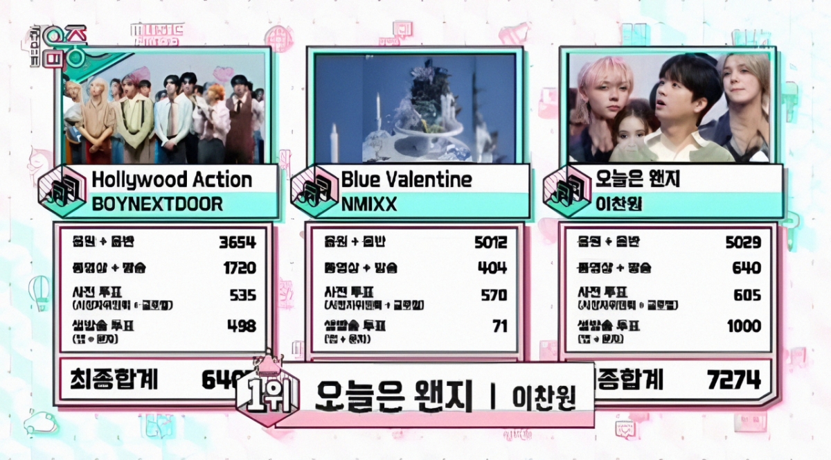 이날 이찬원은 음원+음반 5029점, 동영상+방송 점수 640점, 사전투표(시청자위원회+글로벌) 점수 605점, 실시간 투표(앱+문자) 점수 1000점 등 총 7274점을 얻어 1위를 기록했다.