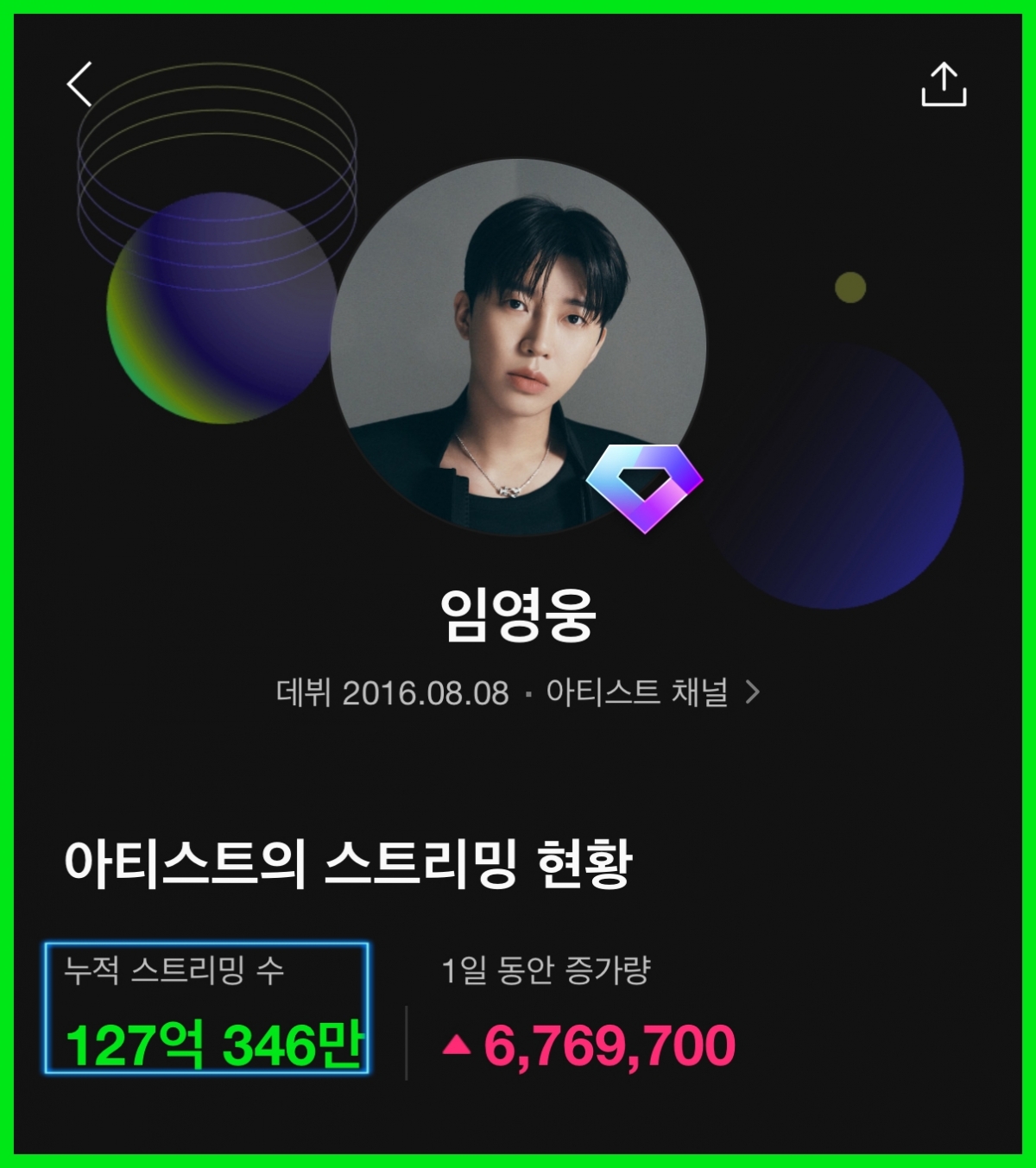 임영웅은 11월 2일 국내 주요 음원 플랫폼 멜론(Melon)에서 누적 스트리밍 127억 회를 넘어섰다. 이날 기준 임영웅의 멜론 누적 스트리밍 수는 127억 346만 회였다.