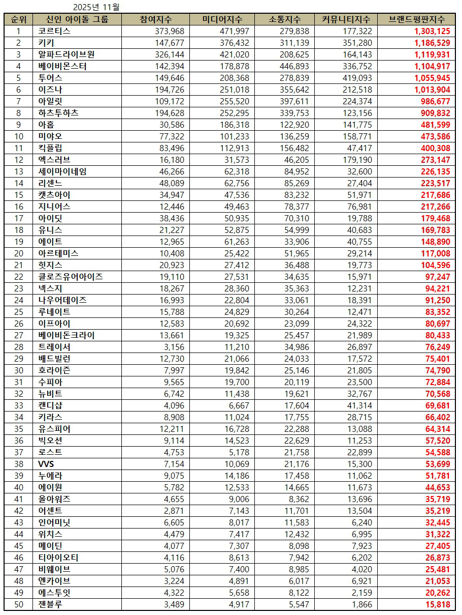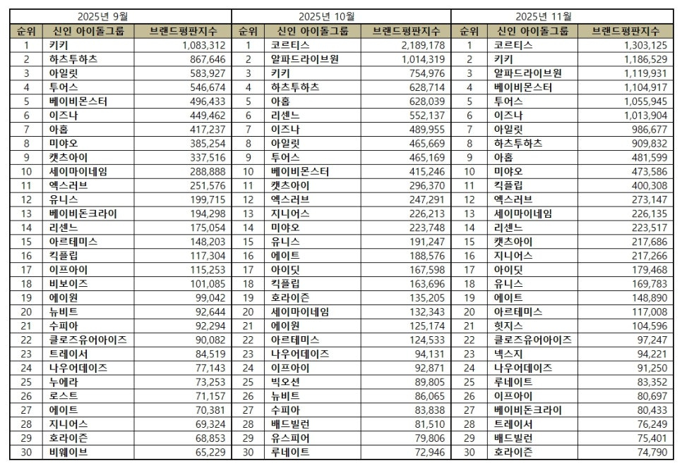신인 아이돌그룹 브랜드평판 2025년 11월 분석에서는 코르티스, 키키, 알파드라이브원, 베이비몬스터, 투어스, 이즈나, 아일릿 , 하츠투하츠, 아홉, 미야오, 킥플립, 엑스러브, 세이마이네임, 리센느, 캣츠아이, 지니어스, 아이딧, 유니스, 에이트, 아르테미스, 힛지스, 클로즈유어아이즈, 넥스지, 나우어데이즈, 루네이트, 이프아이, 베이비돈크라이, 트레이서, 배드빌런, 호라이즌, 수피아, 뉴비트, 캔디샵, 키라스, 유스피어, 빅오션, 로스트, VVS, 누에라, 에이원, 올아워즈, 어센트, 인어미닛, 위치스, 메이딘, 티아이오티, 비웨이브, 엔카이브, 에스투잇, 젠블루를 분석했다.