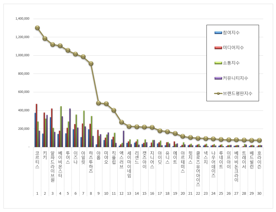 2025년 11월 신인 아이돌그룹 브랜드평판 30위 순위는 코르티스, 키키, 알파드라이브원, 베이비몬스터, 투어스, 이즈나, 아일릿 , 하츠투하츠, 아홉, 미야오, 킥플립, 엑스러브, 세이마이네임, 리센느, 캣츠아이, 지니어스, 아이딧, 유니스, 에이트, 아르테미스, 힛지스, 클로즈유어아이즈, 넥스지, 나우어데이즈, 루네이트, 이프아이, 베이비돈크라이, 트레이서, 배드빌런, 호라이즌 순으로 분석됐다.