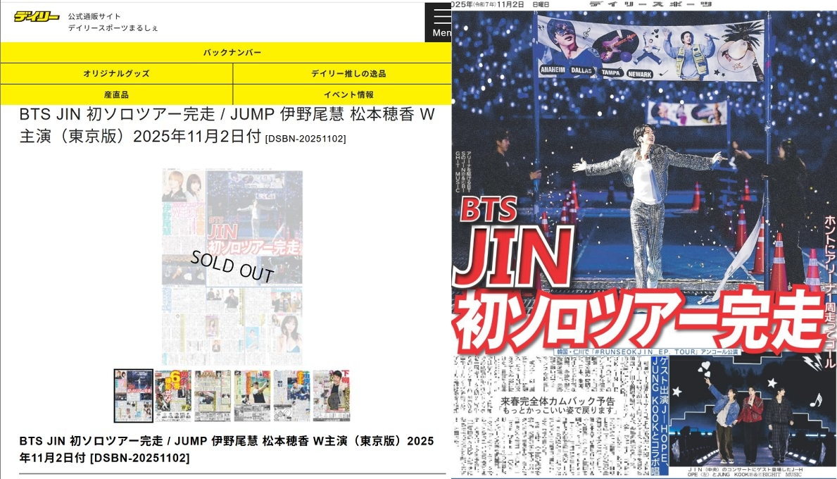 지난 11월 2일, 일본 데일리 스포츠는 "방탄소년단 진, 솔로 투어 앙코르 콘서트 개최 #RUNSEOKJIN_epTOUR …열정적인 피날레 퍼포먼스로 아미 사로잡아"라는 제목으로 진의 앙코르 콘서트 소식을 전했으며 해당 신문은 일본에서 완판됐다. 이외 일본의 3대 스포츠 신문 또한 진의 앙코르 콘서트 소식을 다루며 압도적인 인기를 증명했다.