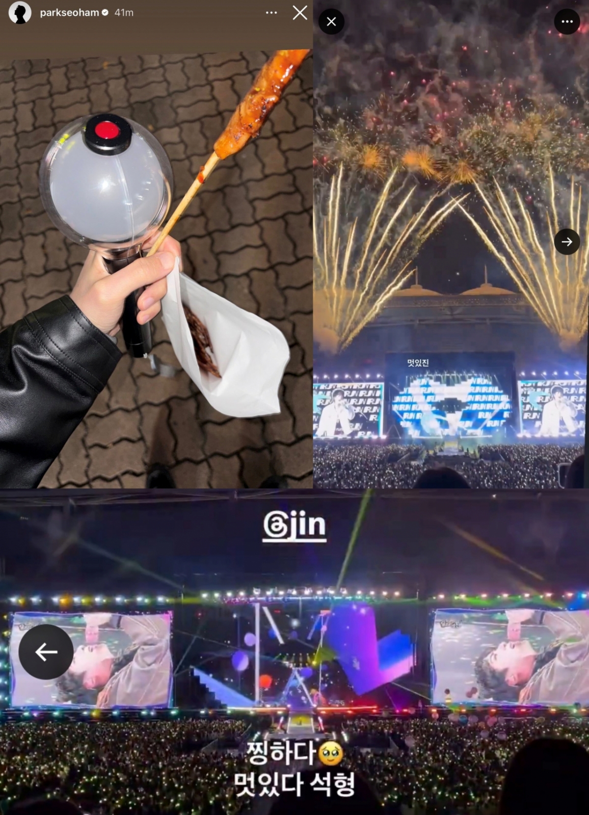 배우 박서함은 자신의 인스타그램에 진이 앙코르 콘서트에서 열정적으로 공연하고 있는 여러 영상과 함께 "멋있진", "찡하다. 멋있다 석형"이라는 문구와 눈물을 참는 이모티콘을 게시하는 등 콘서트 현장의 감동을 전했다. 또 아미밤(방탄소년단 응원봉)과 콘서트장 인근에서 판매하는 간식 사진도 인증했다.