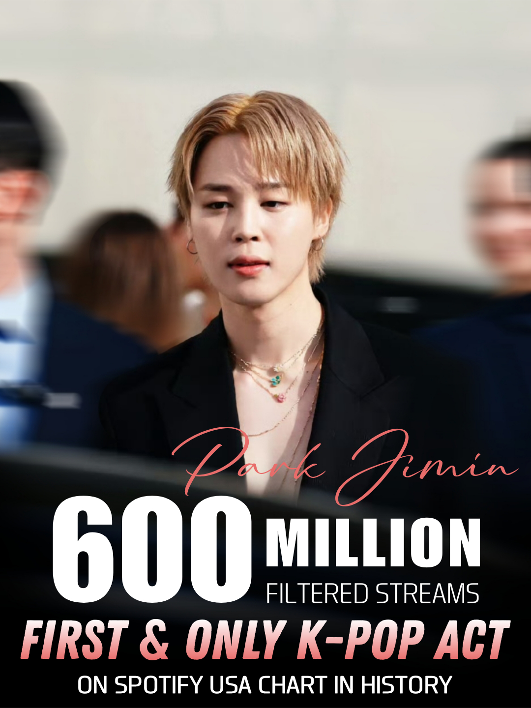 이로써 지민은 스포티파이 미국 차트에서 6억 이상 누적 스트리밍을 달성한 최초이자 유일한 K팝 가수가 되는 대기록을 세웠다.