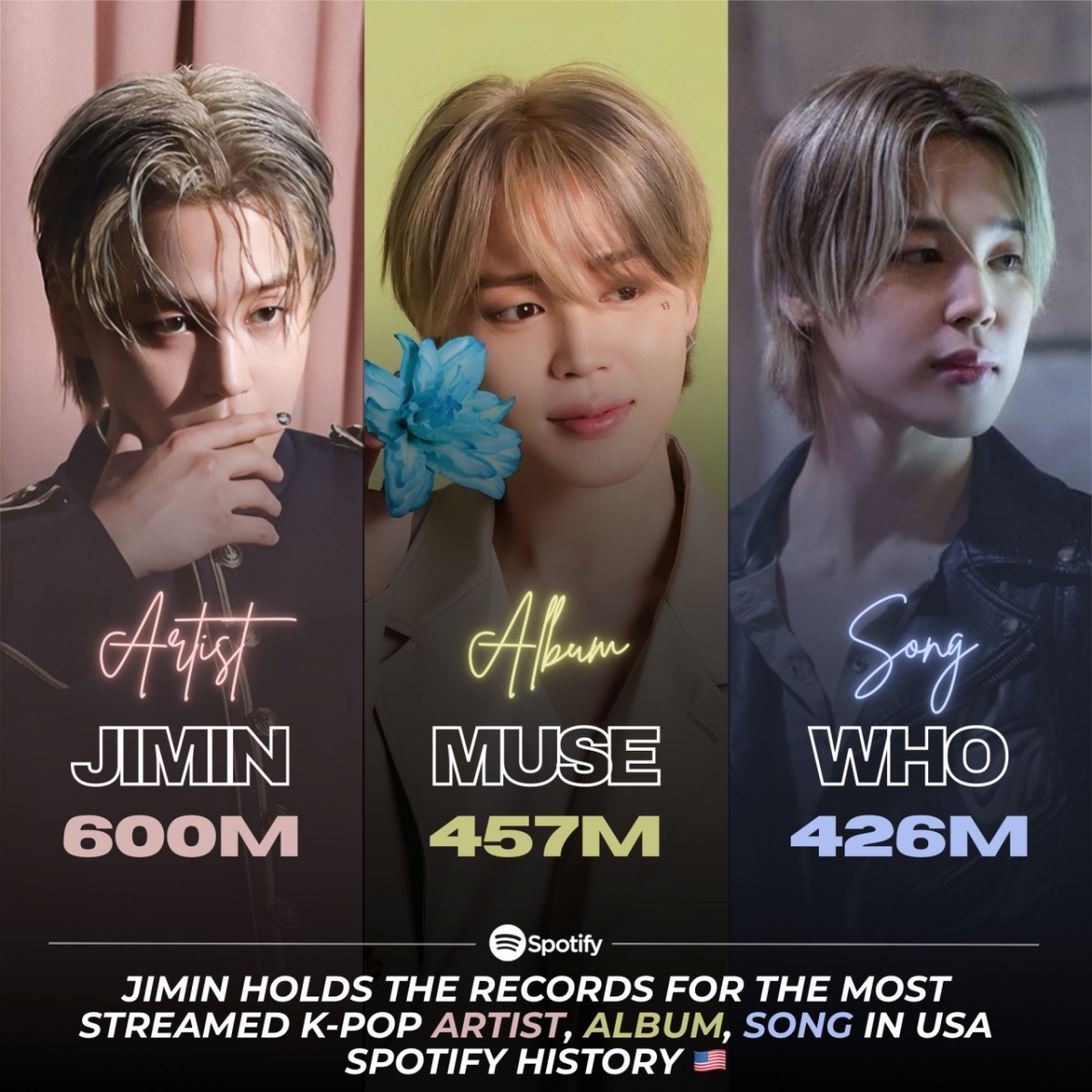 스포티파이 미국 차트에서 4억 5000만 스트리밍을 돌파한 최초이자 유일한 K팝 앨범의 기록을 세운 지민의 2집 'MUSE'(뮤즈)는 스포티파이 미국 '위클리 톱 앨범' 차트에서 59주를 보낸 최초이자 유일한 K팝 솔로 앨범으로 막강한 현지 인기를 증명하고 있다.