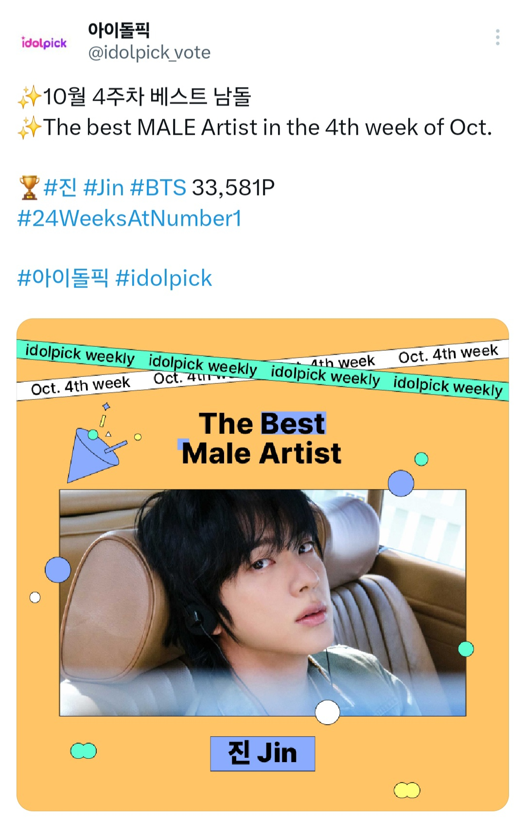 진은 10월 4주차(10월 27일~11월 2일) 위클리 투표에서 3만 3581픽을 얻어 남자 아이돌 개인 부문 1위를 차지했다. 이는 위클리 전체를 통틀어 최다 득표로 진은 24주 연속 1위라는 대기록을 이어가며 글로벌 슈퍼스타다운 막강한 팬덤 파워를 과시했다.