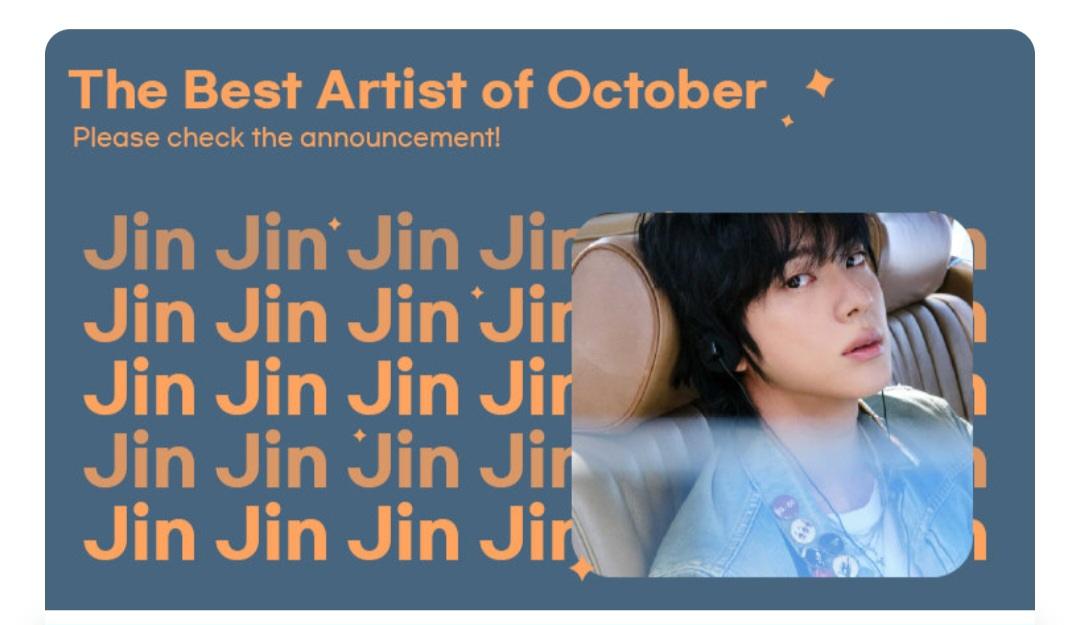 또한 10월 한 달간 누적 22만 1037픽을 얻은 진은 10월 베스트 아티스트의 영예를 거머쥐었다.