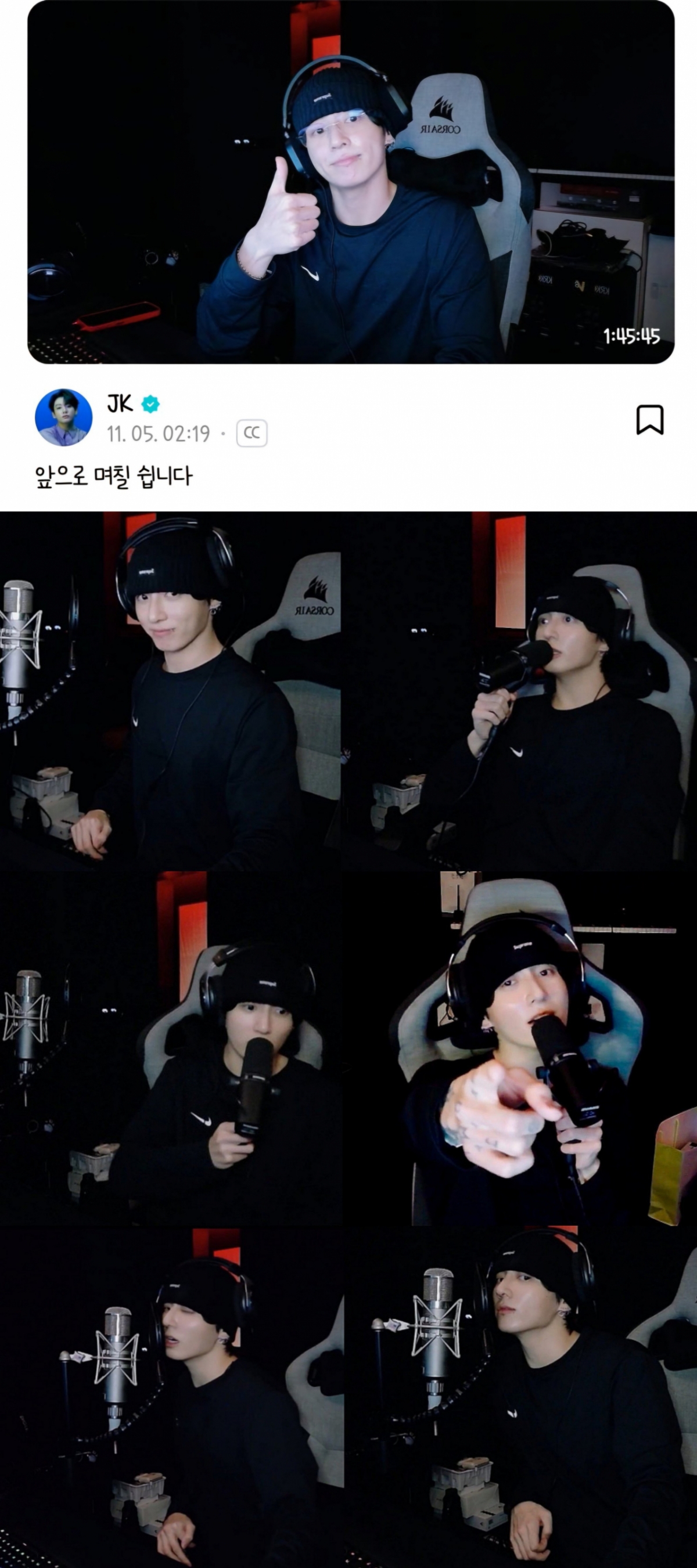 정국은 지난 5일 새벽 팬 커뮤니티 위버스를 통해 '앞으로 며칠 쉽니다'라는 제목으로 개인 라이브 방송을 진행했다.