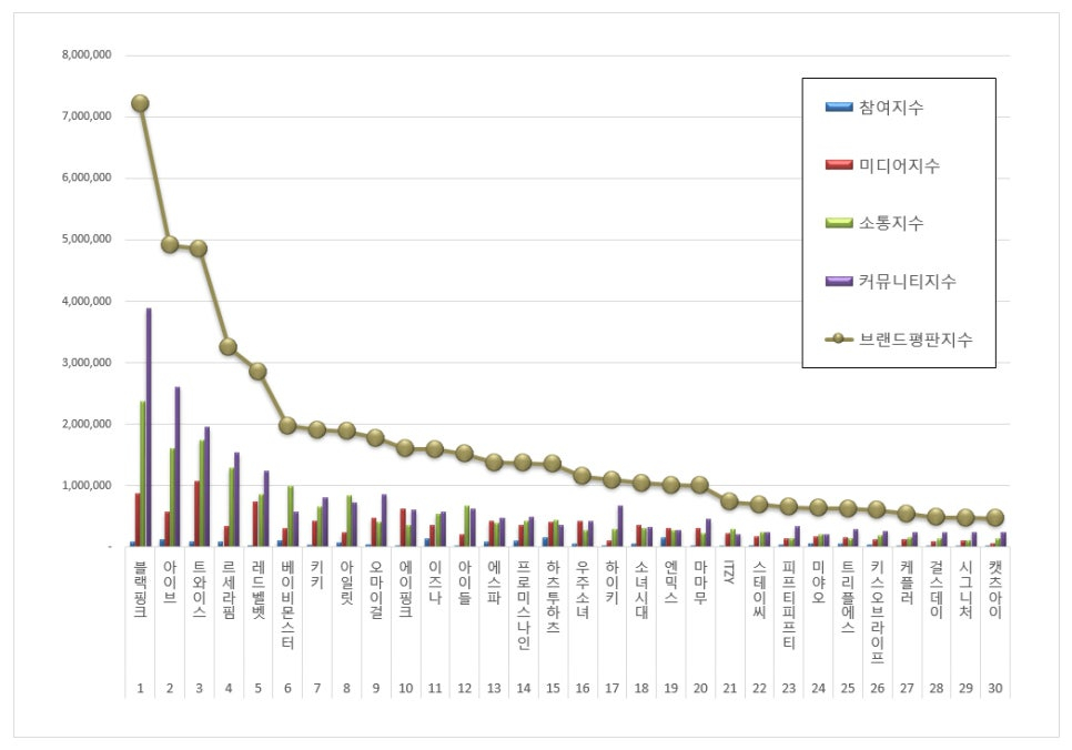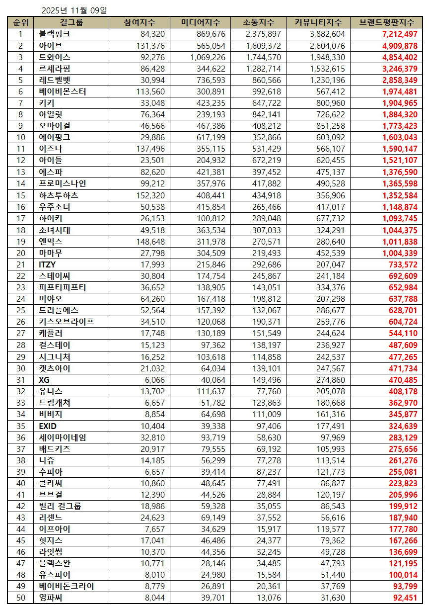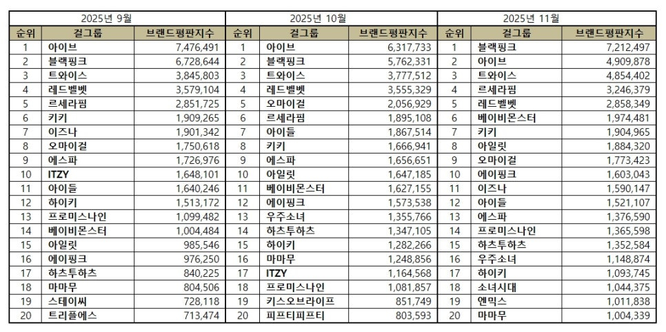2025년 11월 걸그룹 브랜드평판 30위 순위는 블랙핑크, 아이브, 트와이스, 르세라핌, 레드벨벳, 베이비몬스터, 키키, 아일릿, 오마이걸, 에이핑크, 이즈나, 아이들, 에스파, 프로미스나인, 하츠투하츠, 우주소녀, 하이키, 소녀시대, 엔믹스, 마마무, ITZY, 스테이씨, 피프티피프티, 미야오, 트리플에스, 키스오브라이프, 케플러, 걸스데이, 시그니처, 캣츠아이 순이었다.