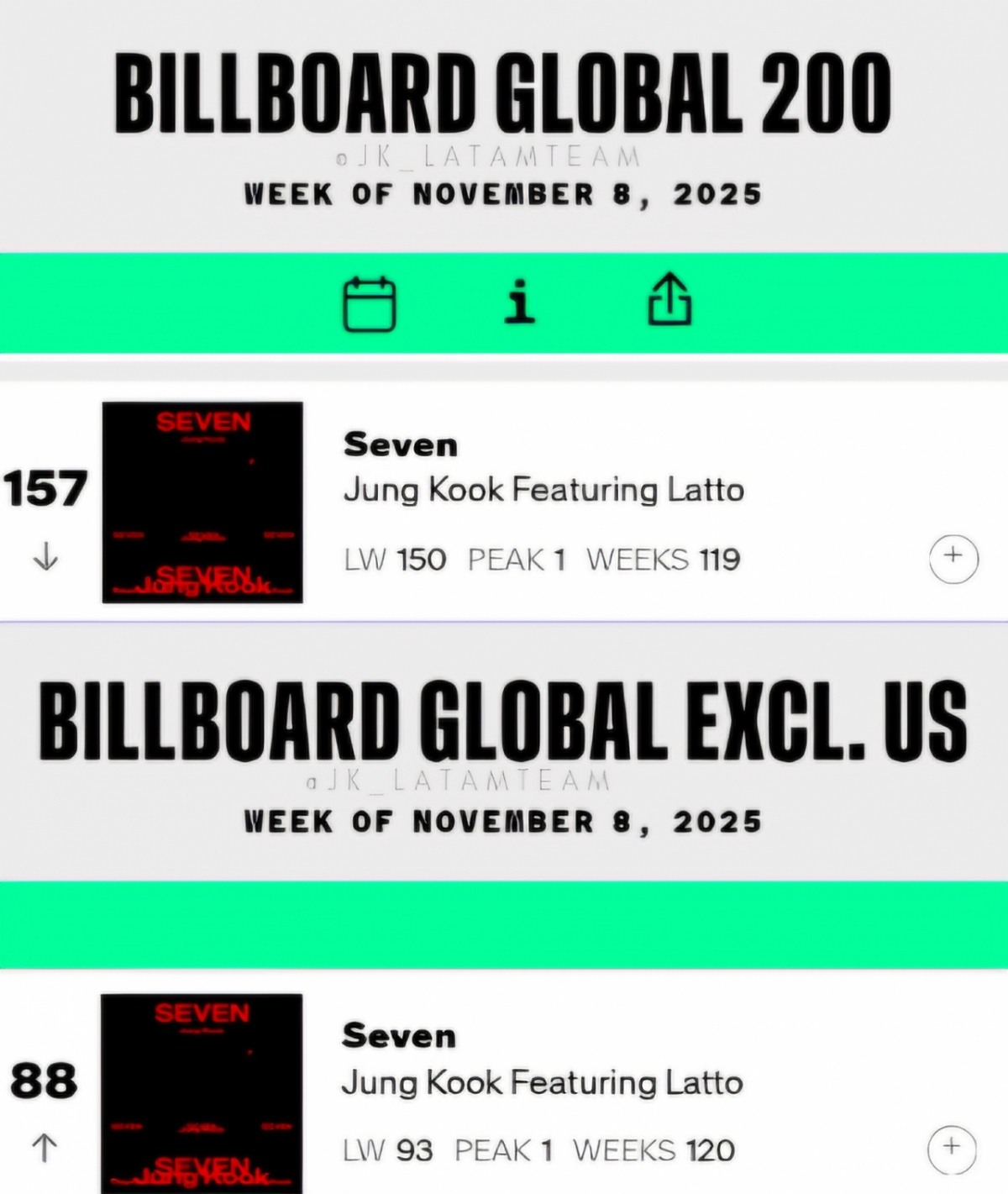 앞서 'Seven'은 빌보드 '글로벌(미국 제외)'에서 9주 연속 1위, '글로벌 200'에서 7주 연속 1위에 올랐고 두 차트에 역대 아시아 가수곡 최초이자 최장 기간인 7주 연속 동시 1위를 달성하는 대기록도 썼다.