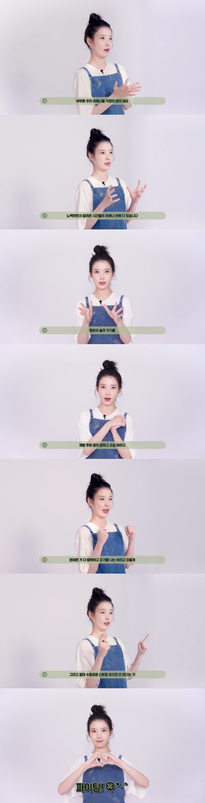 영상에서 아이유는 올해 수능을 보는 수험생들에게 "이맘때쯤 되면 제가 시험 보는 것도 아닌데 괜히 긴장이 되고 이렇게 또 날이 추워져구나 느겨지기도 하고 아무튼 우리 유애나 걱정이 많이 된다"라고 말했다.