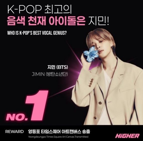 지민은 최근 글로벌 아이돌 인기투표 플랫폼 '하이어(HIGHER)'에서 진행된 'K-POP 최고의 음색 천재 아이돌은?' 설문에서 압도적인 득표율로 1위를 차지했다.