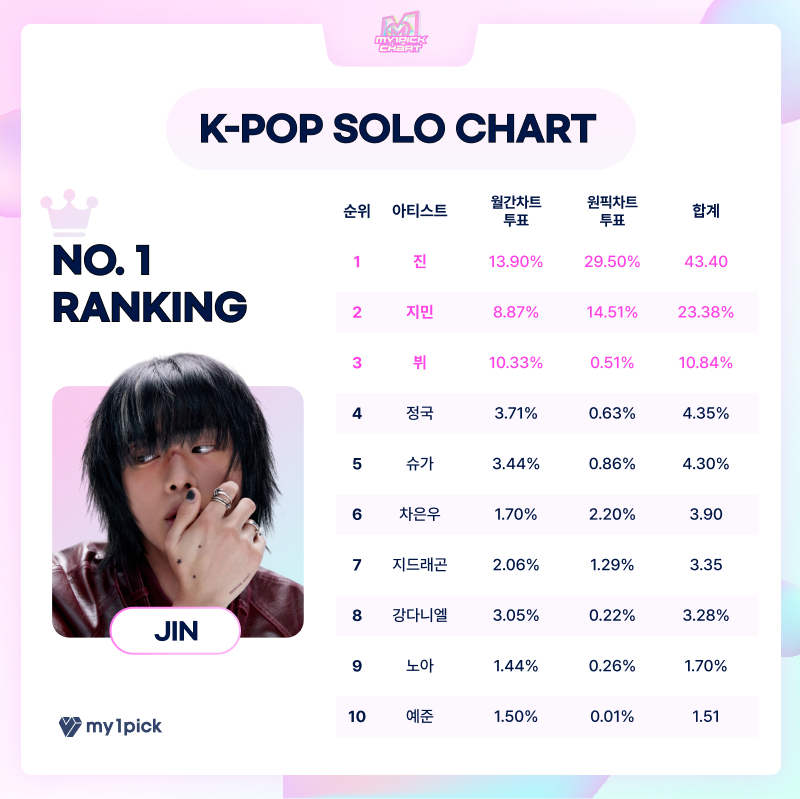 방탄소년단(BTS) 진이 마이원픽(MY1PICK)에서 월간차트 1위를 차지하며 19개월 연속 정상을 이어갔다.