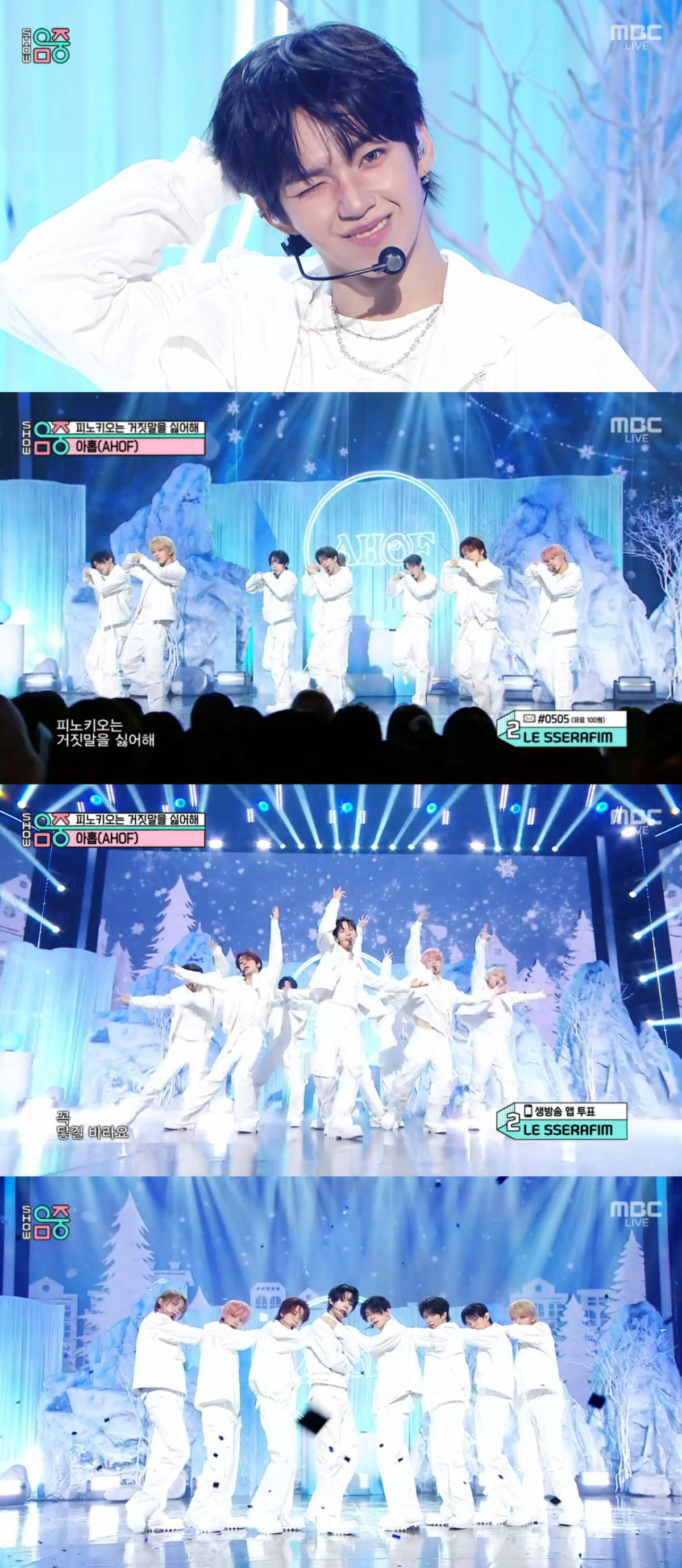 이날 아홉은 마치 겨울 왕국 같은 세트를 구성해 평소와 다른 무대 분위기를 연출했다. 멤버들 또한 각각의 개성을 살리면서 통일감을 준 순백의 스타일링으로 시청자들의 시선을 사로잡았다.