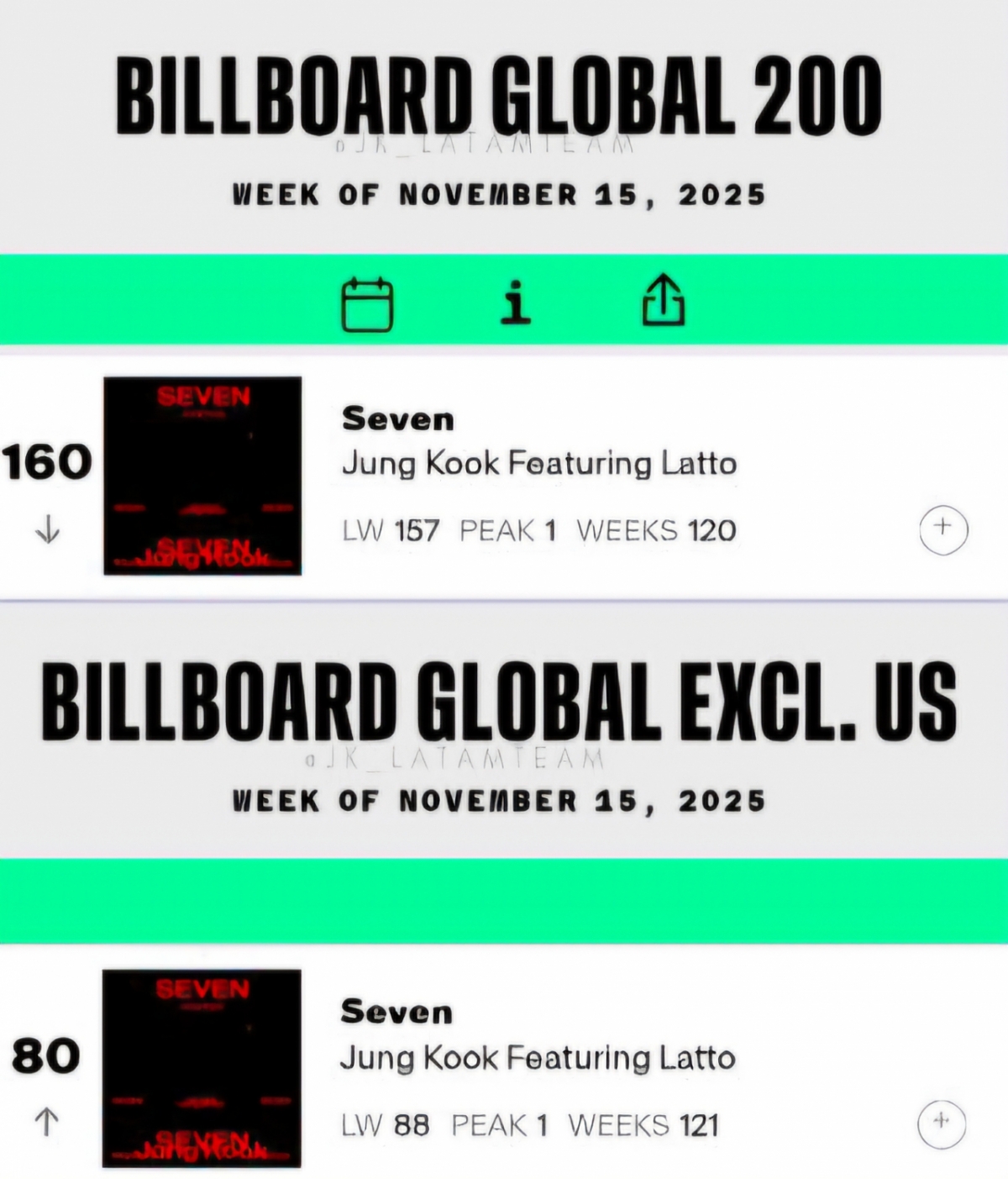 미국 음악 전문 매체 빌보드(Billboard)가 발표한 11월 15일 자 '글로벌 200' 차트에 따르면, 정국이 2023년 발매한 첫 솔로 데뷔곡이자 글로벌 메가 히트송 'Seven'(세븐)은 160위를 차지했다.