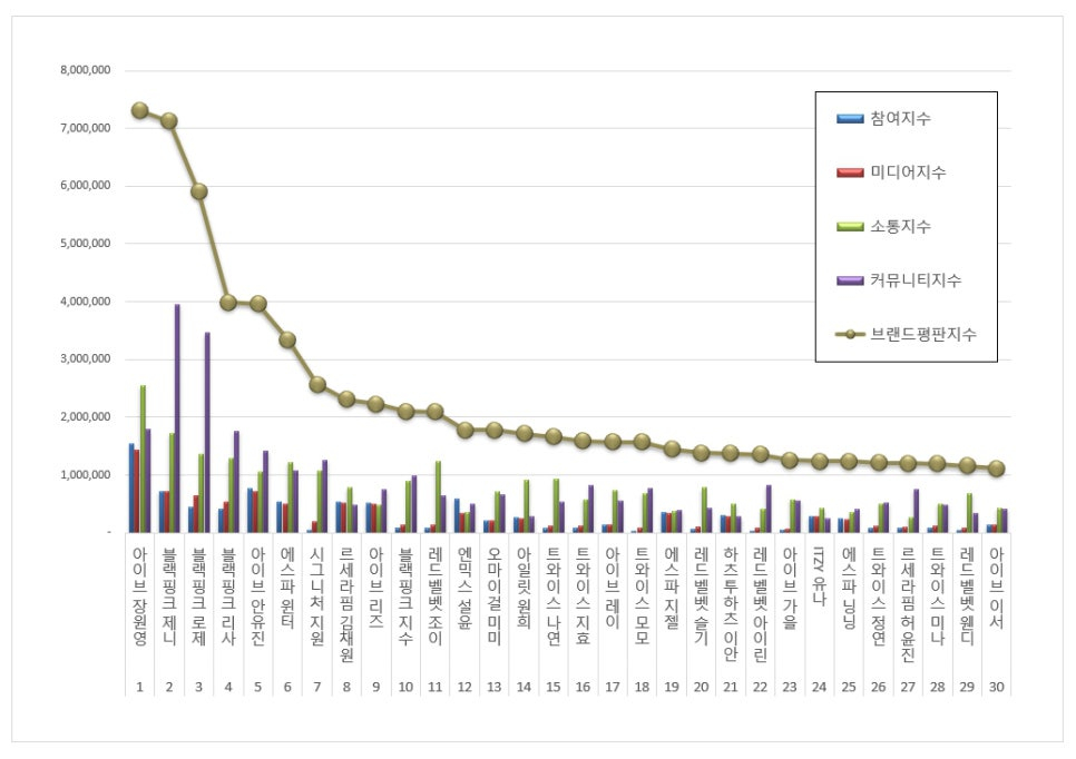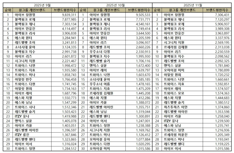 2025년 11월 걸그룹 개인 브랜드평판 30위 순위는 아이브 장원영, 블랙핑크 제니, 블랙핑크 로제, 블랙핑크 리사, 아이브 안유진, 에스파 윈터, 시그니처 지원, 르세라핌 김채원, 아이브 리즈, 블랙핑크 지수, 레드벨벳 조이, 엔믹스 설윤, 오마이걸 미미, 아일릿 원희, 트와이스 나연, 트와이스 지효, 아이브 레이, 트와이스 모모, 에스파 지젤, 레드벨벳 슬기, 하츠투하츠 이안, 레드벨벳 아이린, 아이브 가을, ITZY 유나, 에스파 닝닝, 트와이스 정연, 르세라핌 허윤진, 트와이스 미나, 레드벨벳 웬디, 아이브 이서 순으로 분석됐다.