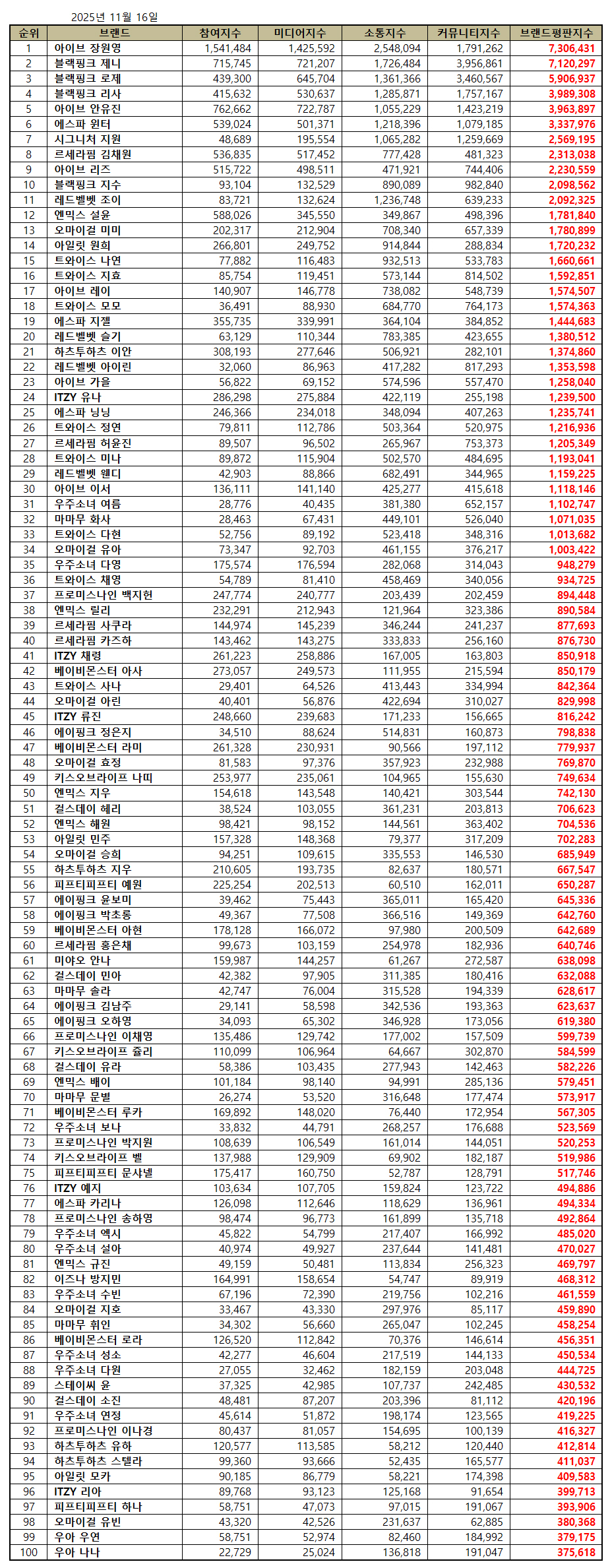 2025년 11월 걸그룹 개인 브랜드평판 100위 브랜드는 아이브 장원영, 블랙핑크 제니, 블랙핑크 로제, 블랙핑크 리사, 아이브 안유진, 에스파 윈터, 시그니처 지원, 르세라핌 김채원, 아이브 리즈, 블랙핑크 지수, 레드벨벳 조이, 엔믹스 설윤, 오마이걸 미미, 아일릿 원희, 트와이스 나연, 트와이스 지효, 아이브 레이, 트와이스 모모, 에스파 지젤, 레드벨벳 슬기, 하츠투하츠 이안, 레드벨벳 아이린, 아이브 가을, ITZY 유나, 에스파 닝닝, 트와이스 정연, 르세라핌 허윤진, 트와이스 미나, 레드벨벳 웬디, 아이브 이서, 우주소녀 여름, 마마무 화사, 트와이스 다현, 오마이걸 유아, 우주소녀 다영, 트와이스 채영, 프로미스나인 백지헌, 엔믹스 릴리, 르세라핌 사쿠라, 르세라핌 카즈하, ITZY 채령, 베이비몬스터 아사, 트와이스 사나, 오마이걸 아린, ITZY 류진, 에이핑크 정은지, 베이비몬스터 라미, 오마이걸 효정, 키스오브라이프 나띠 , 엔믹스 지우, 걸스데이 혜리, 엔믹스 해원, 아일릿 민주, 오마이걸 승희, 하츠투하츠 지우, 피프티피프티 예원, 에이핑크 윤보미, 에이핑크 박초롱, 베이비몬스터 아현, 르세라핌 홍은채, 미야오 안나, 걸스데이 민아, 마마무 솔라, 에이핑크 김남주, 에이핑크 오하영, 프로미스나인 이채영, 키스오브라이프 쥴리, 걸스데이 유라, 엔믹스 배이, 마마무 문별, 베이비몬스터 루카, 우주소녀 보나, 프로미스나인 박지원, 키스오브라이프 벨 , 피프티피프티 문샤넬, ITZY 예지, 에스파 카리나, 프로미스나인 송하영, 우주소녀 엑시, 우주소녀 설아, 엔믹스 규진, 이즈나 방지민, 우주소녀 수빈, 오마이걸 지호, 마마무 휘인, 베이비몬스터 로라, 우주소녀 성소, 우주소녀 다원, 스테이씨 윤, 걸스데이 소진, 우주소녀 연정, 프로미스나인 이나경, 하츠투하츠 유하, 하츠투하츠 스텔라, 아일릿 모카, ITZY 리아, 피프티피프티 하나, 오마이걸 유빈, 우아 우연, 우아 나나 순으로 분석됐다.