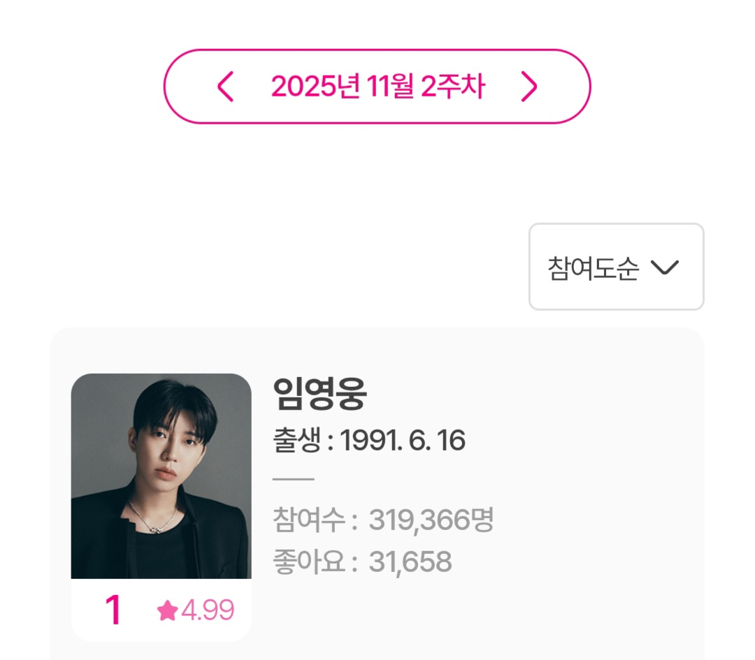 임영웅은 11월 10일부터 11월 16일까지 집계된 11월 2주차 아이돌차트 평점랭킹에서 31만 9366표를 얻어 1위를 차지했다.
