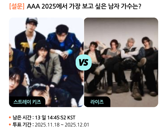 종합 엔터테인먼트 모바일 앱 스타폴(STARPOLL)에서는 18일부터 오는 12월 1일까지 'AAA 2025에서 가장 보고 싶은 남자 가수는?'이라는 주제로 설문을 진행한다.