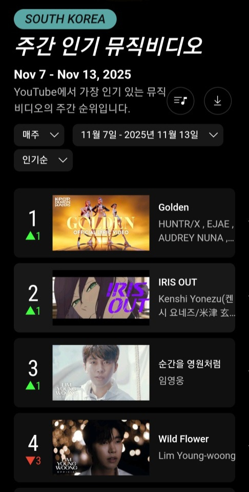 11월 7일~11월 13일자 유튜브 한국 주간 인기뮤직비디오 1위는 넷플릭스 '케이팝 데몬 헌터스' OST 'Golden'이 올랐으며, 2위는 일본 애니메이션 '체인소맨 레제편' 극장판 OST 'IRIS OUT'이 올라 임영웅의 존재감을 더욱 빛나게 했다.