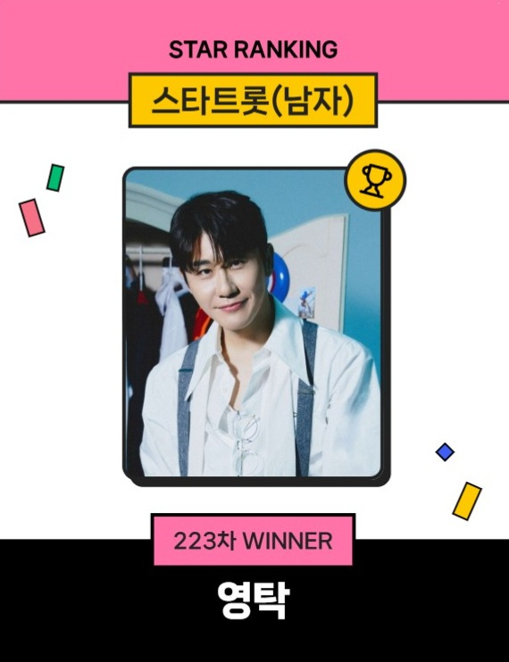 영탁은 지난 13일 오후 3시 1분부터 20일 오후 3시까지 진행된 223차 스타랭킹 스타트롯 남자 랭킹 투표에서 23만 7749표를 받아 1위에 등극했다.