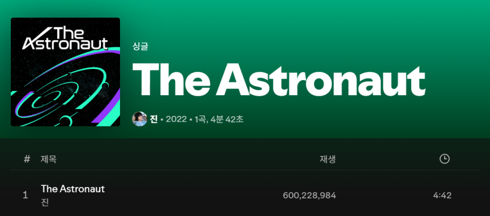 방탄소년단(BTS) 진의 솔로 싱글 'The Astronaut'(디 애스트로넛)이 스포티파이에서 6억 스트리밍을 돌파하며 글로벌 인기를 빛냈다.