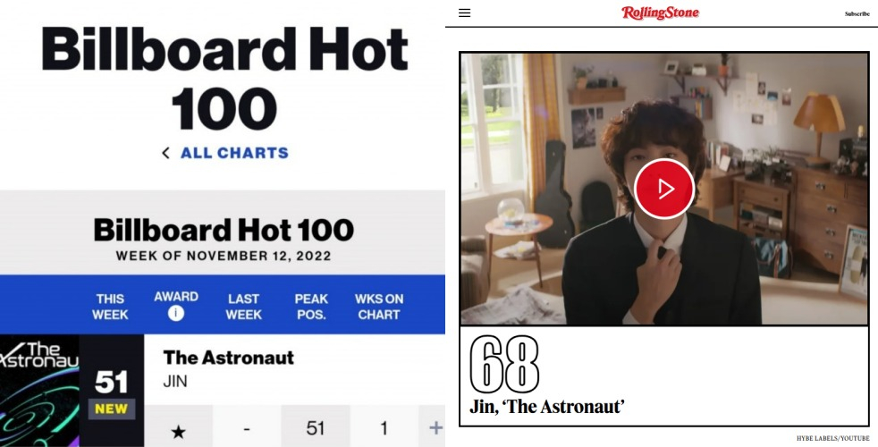 미국 롤링스톤의 '2022 Top 100 Best Songs'에서 68위를 차지하며 한국 솔로 가수로는 유일하게 이름을 올렸는데, 이는 진의 음악이 단순한 팬덤 지지에 그치지 않고 음악계 전반에서도 충분한 평가를 받고 있음을 보여주는 지표다.