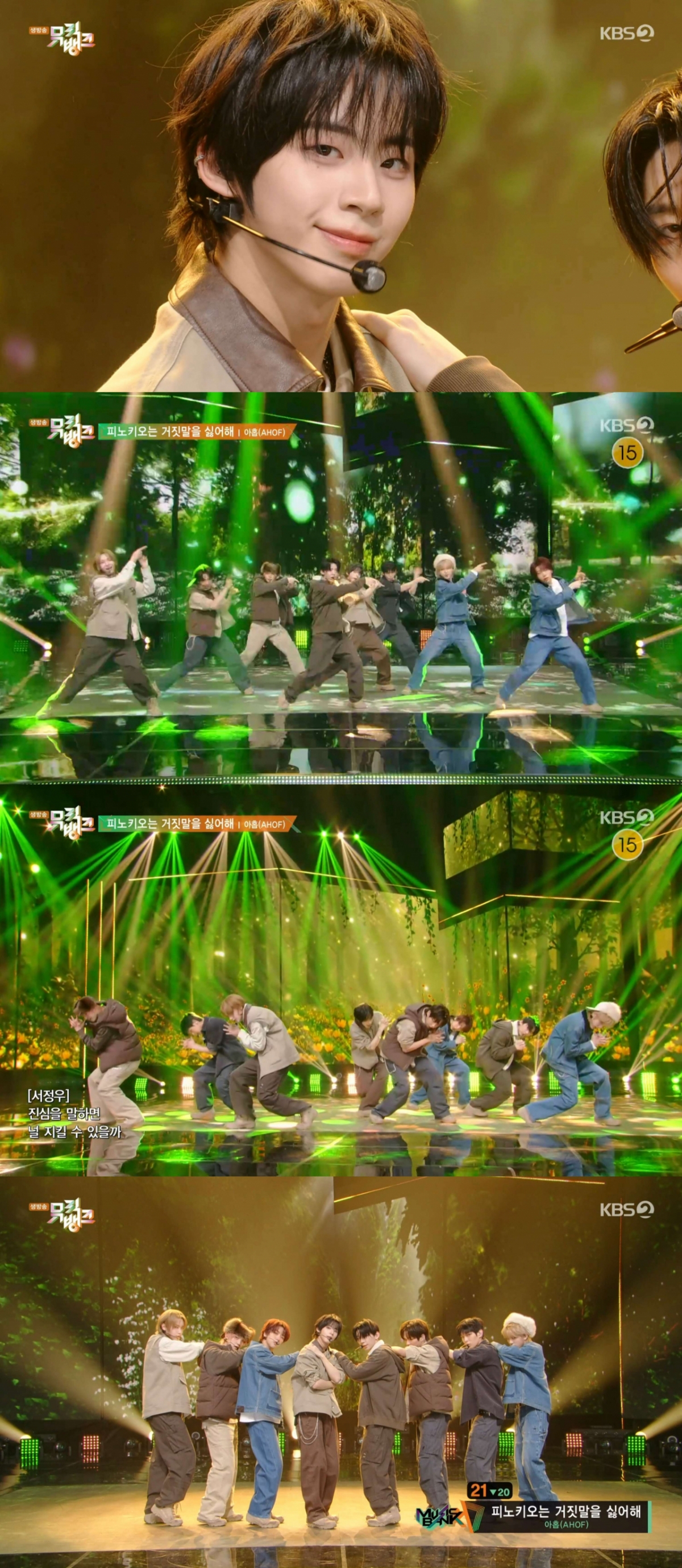 아홉(스티븐, 서정우, 차웅기, 장슈아이보, 박한, 제이엘, 박주원, 즈언, 다이스케)은 21일 오후 방송된 KBS2 '뮤직뱅크'에 출연해 미니 2집 'The Passage(더 패시지)'의 타이틀곡 '피노키오는 거짓말을 싫어해' 퍼포먼스를 선보였다.