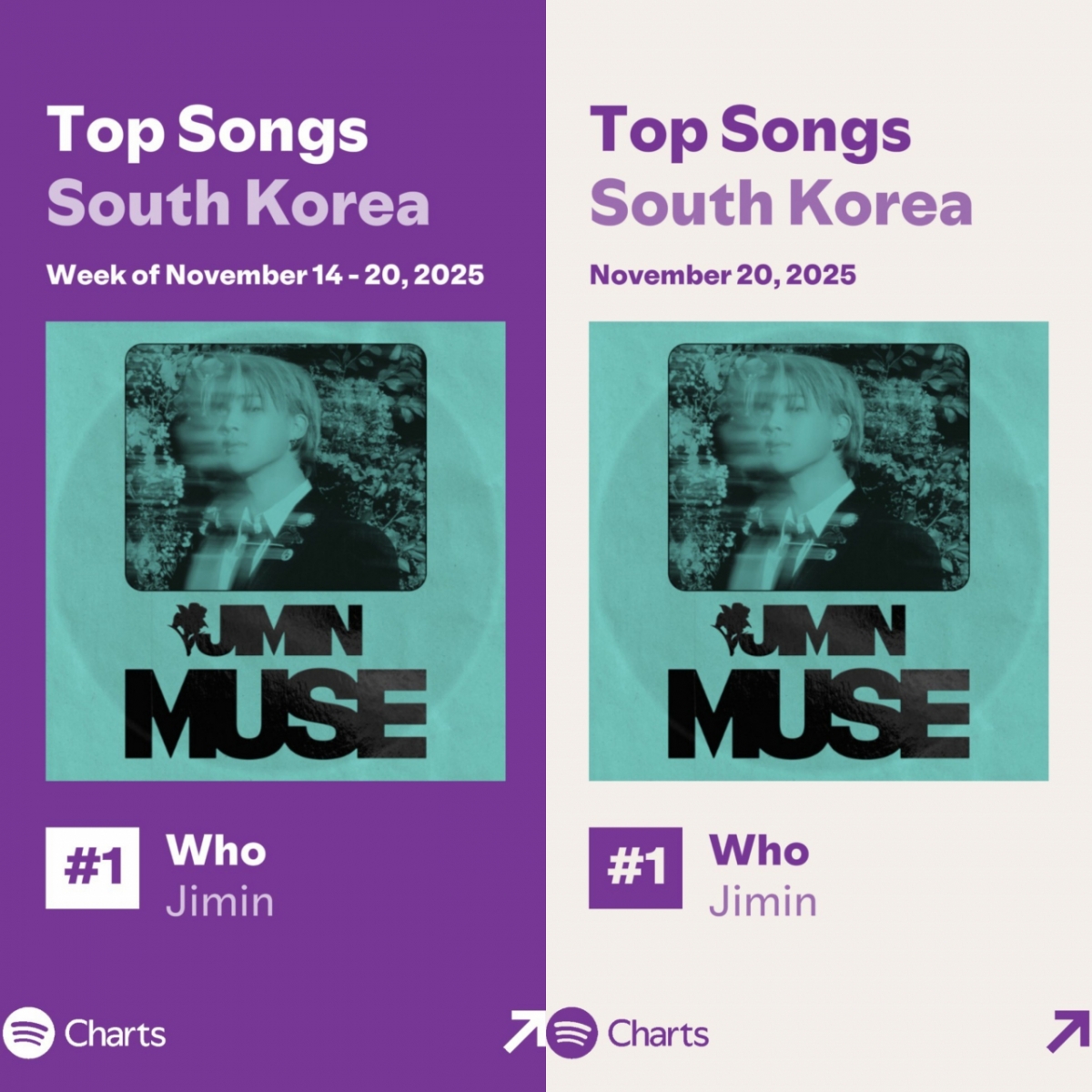 세계 최대 음원 플랫폼 스포티파이 11월 20일자 차트에 따르면, 지민의 2집 솔로앨범 'MUSE'(뮤즈) 타이틀곡 'Who'(후)는 스포티파이 한국 '위클리 톱 송' 차트에서 65주째 1위에 올랐다.