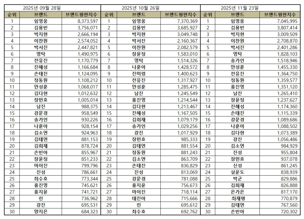 2025년 11월 트로트 가수 브랜드평판 30위 순위는 임영웅, 김용빈, 박지현, 이찬원, 박서진, 영탁, 송가인, 안성훈, 전유진, 정동원, 홍진영, 남진, 장윤정, 진해성, 손태진, 강문경, 나훈아, 김다현, 강진, 김소연, 진성, 장민호, 신성, 설운도, 박군, 김희재, 은가은, 최재명, 김태연, 손빈아 순으로 분석됐다.