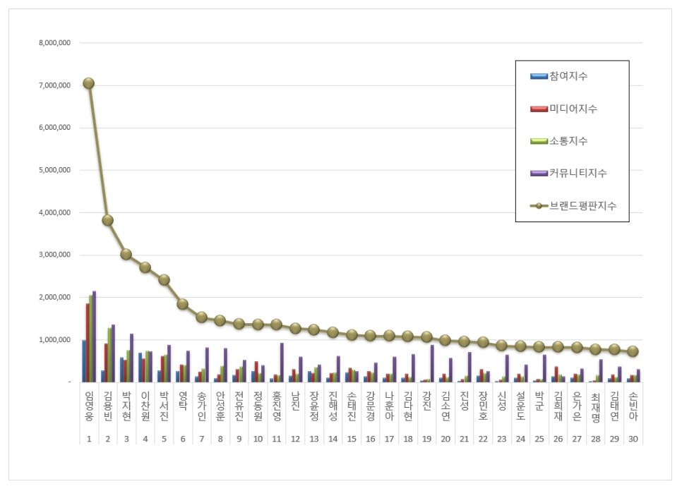 트로트 가수 브랜드평판 1위를 기록한 임영웅 브랜드는 참여지수 989,538 미디어지수 1,853,580 소통지수 2,056,714 커뮤니티지수 2,146,163이 되면서 브랜드평판지수 7,045,995로 분석됐다.