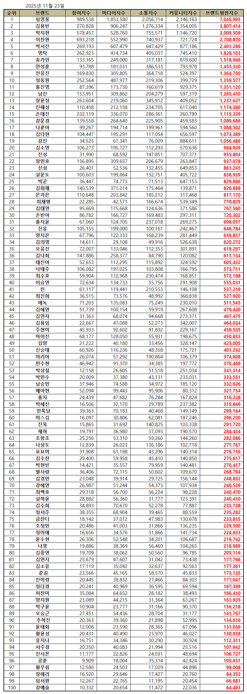 임영웅은 11월 23일 한국기업평판연구소가 발표한 트로트 가수 브랜드평판 2025년 11월 빅데이터 분석결과, 1위를 차지했다. 2위는 김용빈, 3위는 박지현 순이었다. 임영웅은 이로써 59개월 연속 1위에 오르며 막강 존재감을 보여줬다.