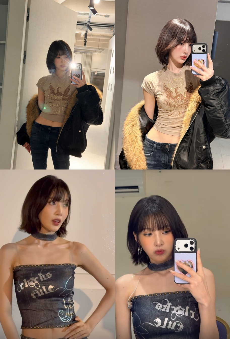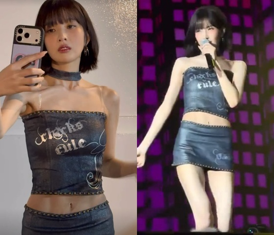 사진과 영상 속 조이는 슬림핏 크롭 반팔 티셔츠에 청바지, 퍼 재킷을 입고 캐주얼한 패션을 선보였다.
