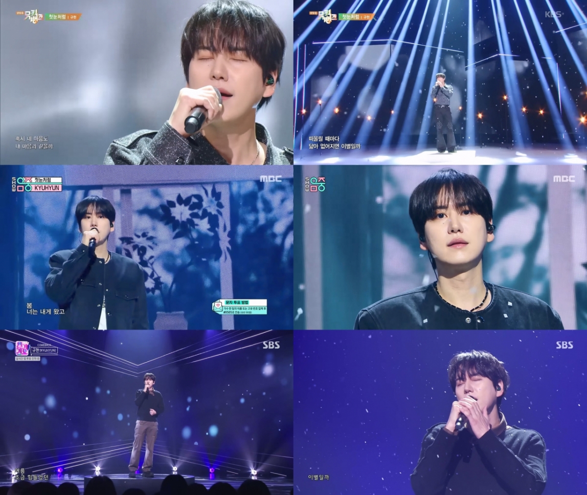 규현은 지난 20일 EP 'The Classic'을 발매한 가운데, 21일 KBS2 '뮤직뱅크'를 시작으로 MBC '쇼! 음악중심', SBS '인기가요'에 잇달아 출연해 타이틀곡 '첫눈처럼' 컴백 무대를 꾸몄다.