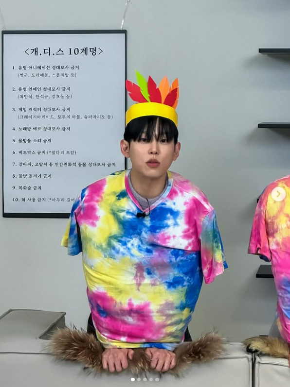 사진 속 폴킴은 최근 온라인 커뮤니티에서 밈으로 퍼진 '아미새(아름답고 미운 새)'를 패러디한 모습. 형형색색의 티셔츠를 입고 머리에 깃털 장식을 쓴 폴킴은 어리숙한 표정을 지으며 보는 이들을 폭소케 만들었다.