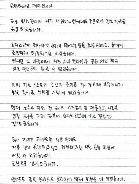 저는 법적 권리에 따라 페임어스엔터테인먼트와의 전속 계약을 종료하였습니다.