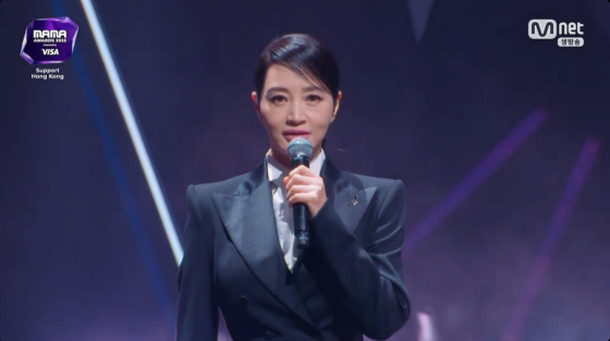 이날 김혜수는 검은색 정장을 입고 무대에 올라 올해 '마마 '콘셉트인 '어-흥'에 대해 한국어와 영어로 설명했다. 추모 리본도 패용했다.