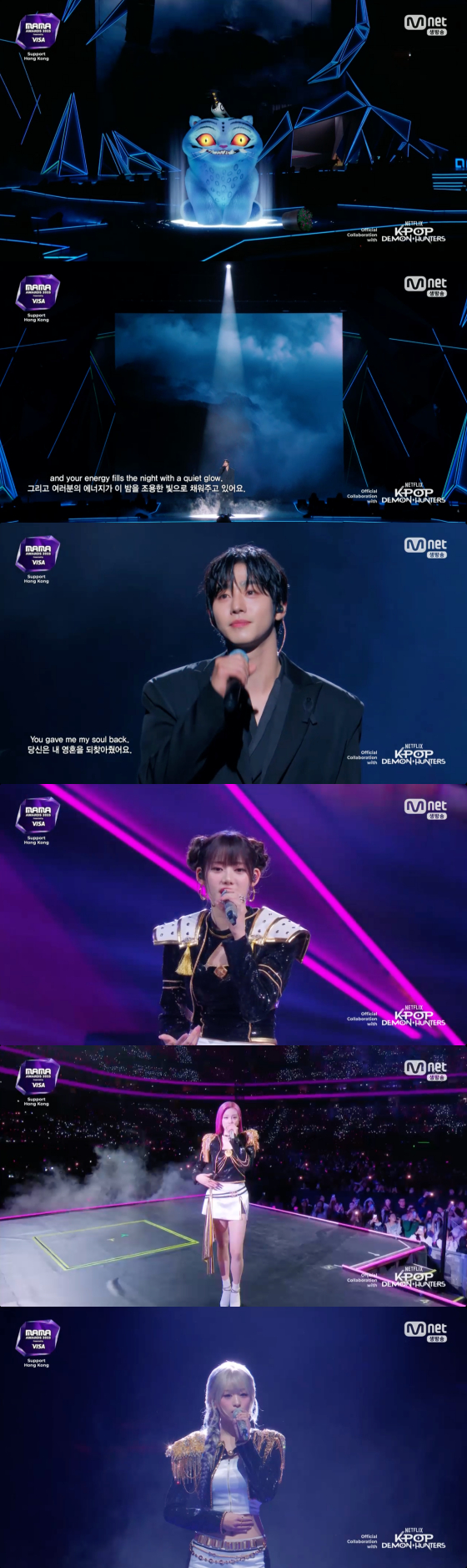 안효섭이 무대에서 내려간 후 '케데헌' 헌트릭스로 변신한 베이비몬스터 파리타, 아현, 로라가 무대에 올라 히트곡 '골든'을 열창했다.